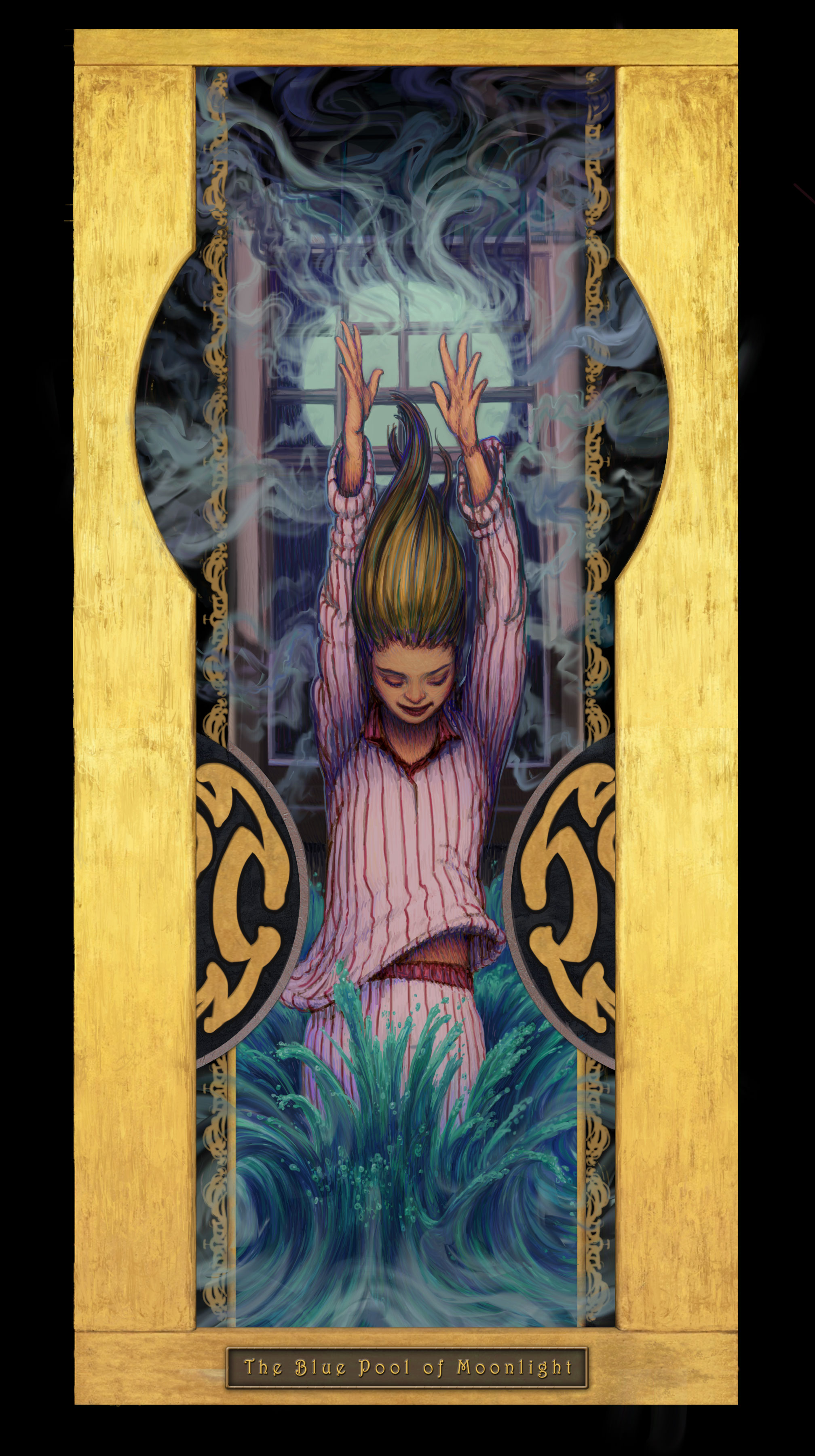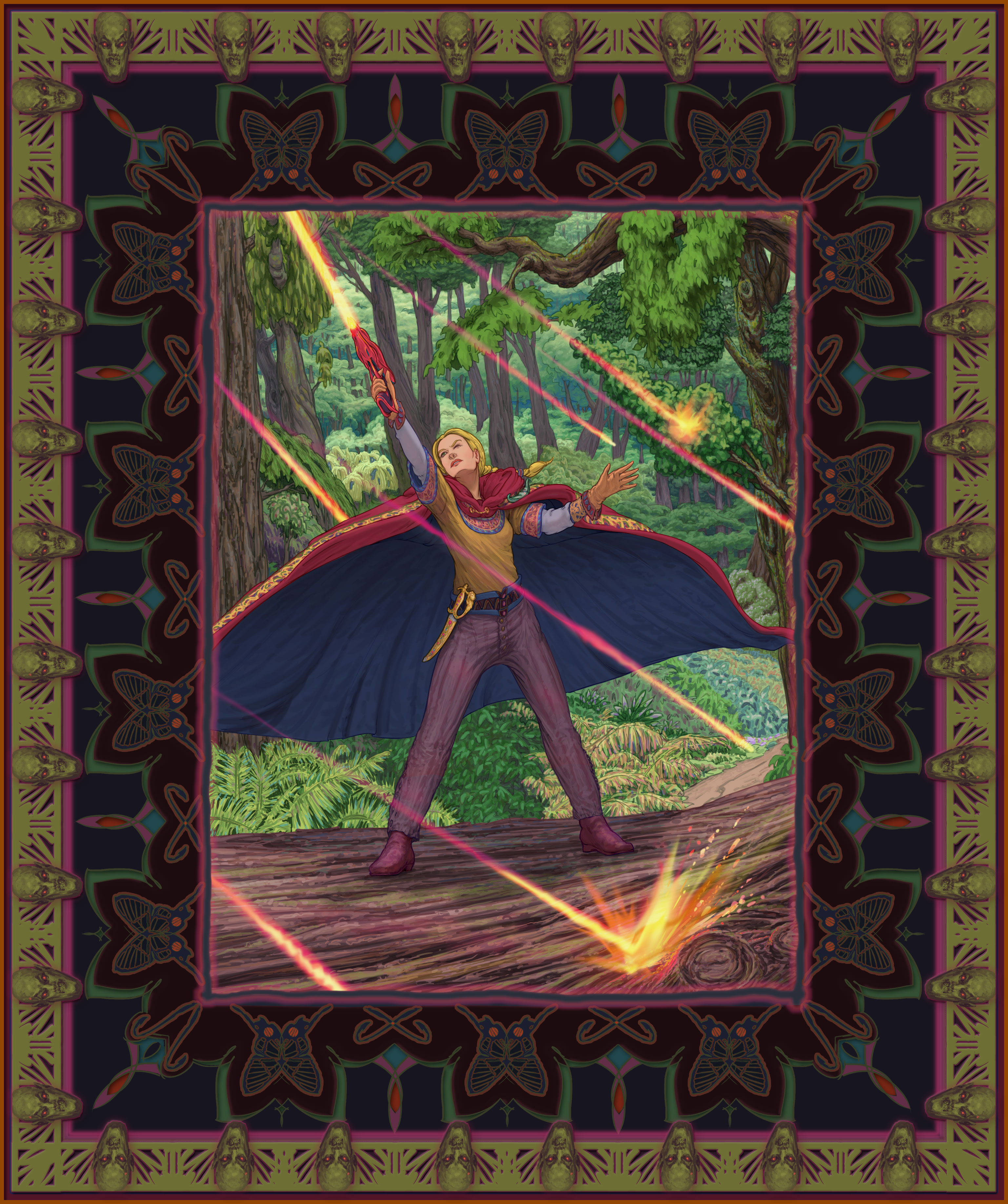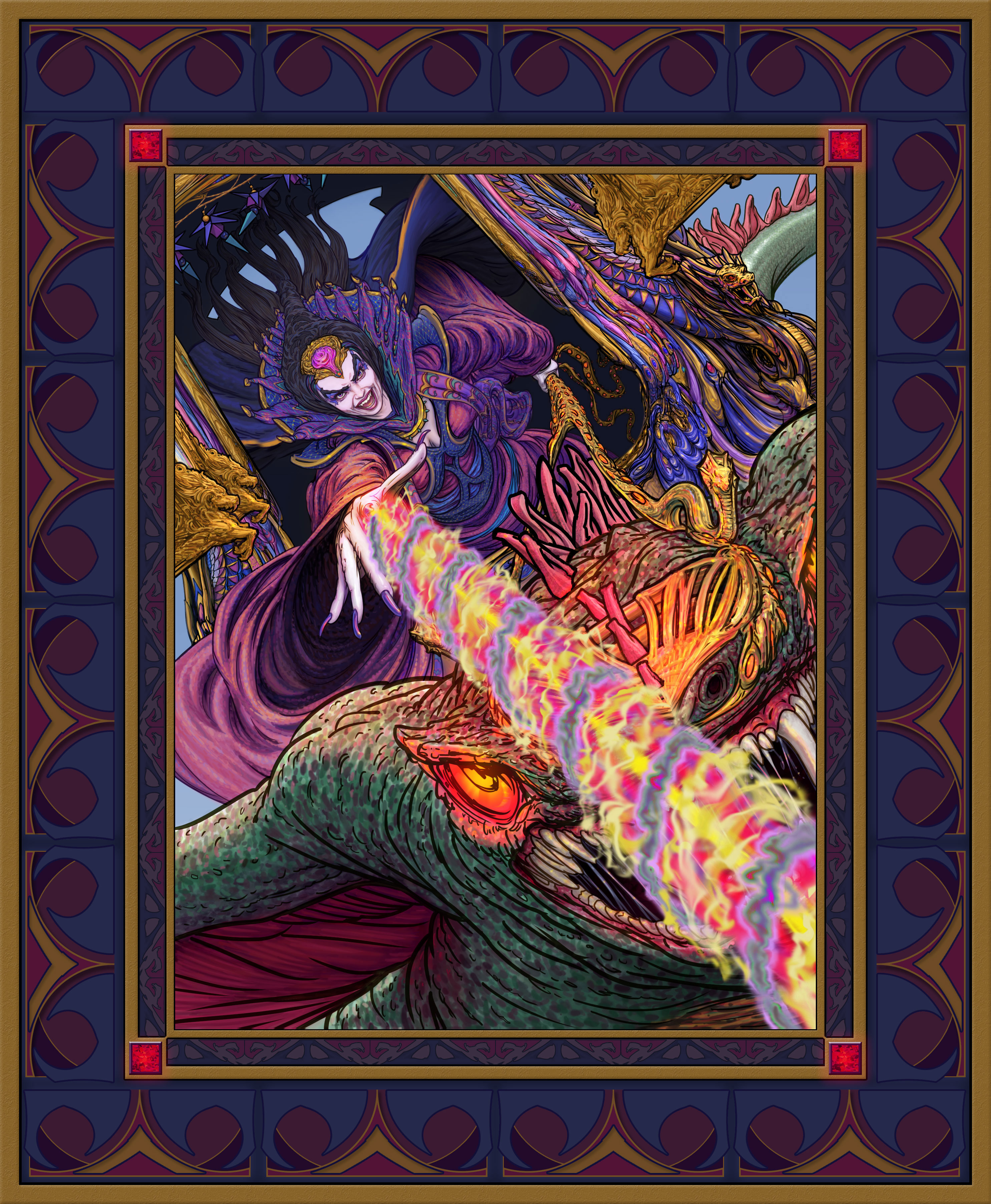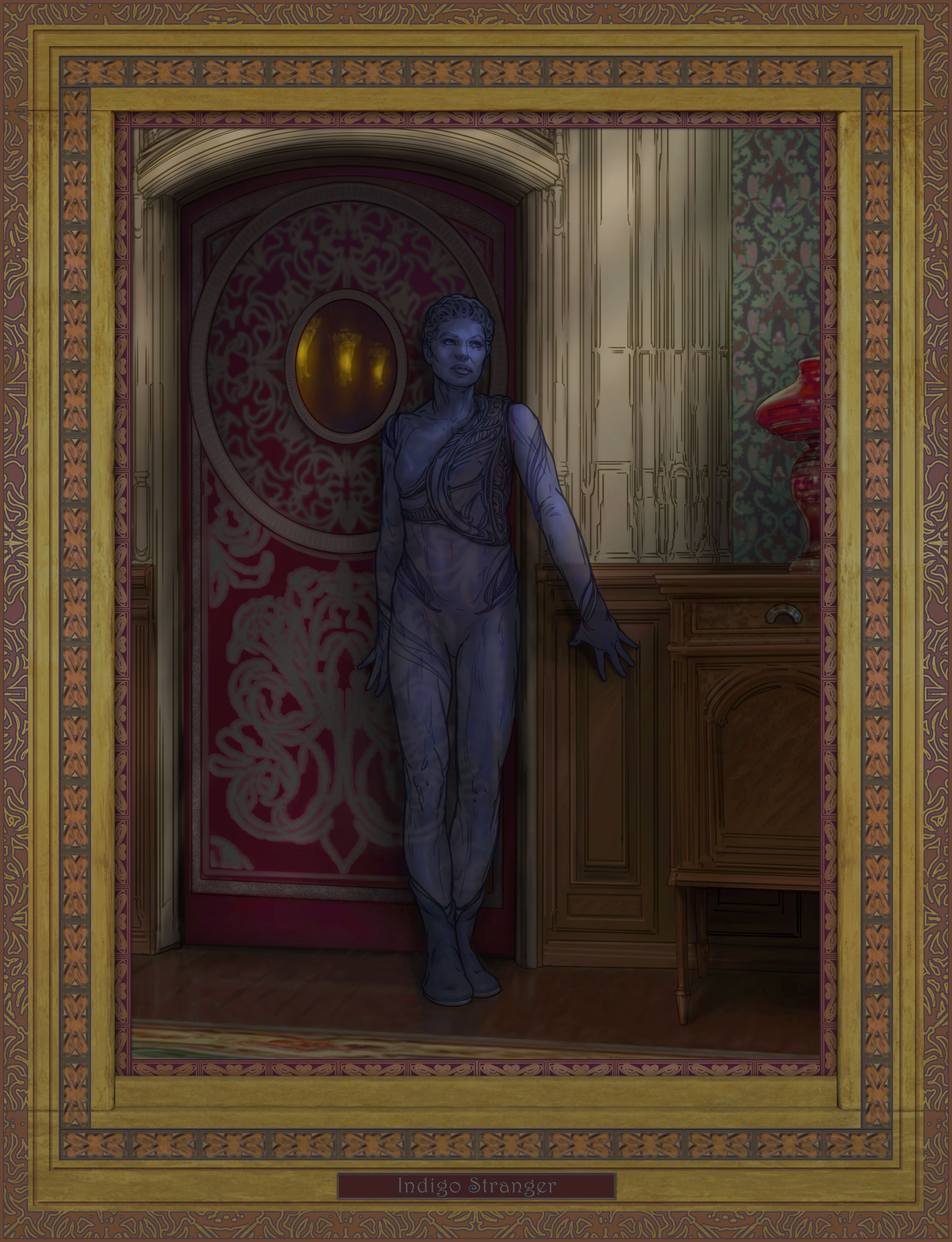 Smirking at her younger sister’s rebuke, S’ilKuSheere strutted past the departing butlers, past Mistraya and her flowing, purple robes, and into the heart of the luxurious bedchamber. Before her, visible between the parted draperies of the bedstead, the stricken Maiden Portent lay looking like a young Sleeping Beauty in state. Sidestepping her LuggageBox, Mistraya followed on the heels of her shapely sister, whereby they joined Brutessa and Insensatia in observation.